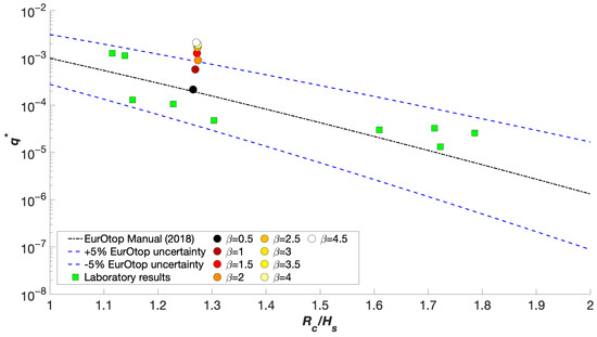 For the reasons described above, the simulation of 150 overtopping waves was considered enough to get a stable value of . Therefore, for different values of , the number of overtopping waves used to calculate was always the same, but the simulations duration was different, leading to different values of the non-dimensional mean overtopping discharge .