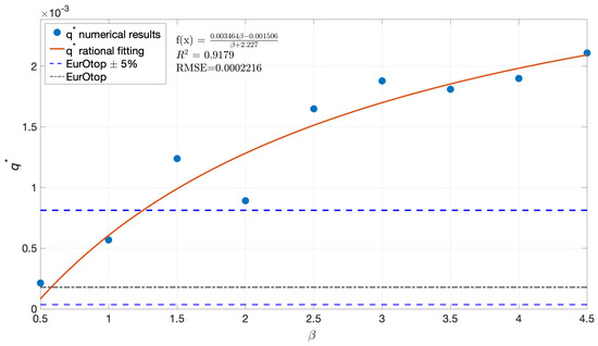 The fitting of a rational law to the data is shown to help visualize the trend, and it is consistent with the expected asymptotic behaviour for increasing values of . Indeed, the increase in the overtopping discharge when increases is physically understandable: if increases, the friction inside the porous layer also increases, which means that the wave finds it more difficult to permeate the layer, and, as a consequence, the run-up behavior is intensified. Theoretically, if were infinite, the armour layer could be expected to behave like a wall, since the resistance offered to permeation would be infinite (i.e., the water would not be able to enter the layer). As mentioned in Section 1, even if this qualitative result could be expected, its magnitude had not been investigated before.
