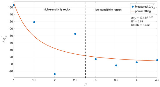Figure 5 shows the value against the value of . Just like in the previous figure, a parametric curve was fitted to the data to help visualize the trend. In this case a power law was used for the fitting, consistent with the x-axis being an horizontal asymptote. Indeed, for increasing values of its effect on the overtopping discharge should decrease, and the percentage change should then become closer and closer to zero.
