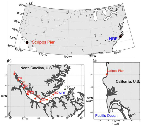 Locations of study areas, the NRE system and Scripps Pier, in the USA (a), and locations of sampling stations at the (b) NRE and (c) Scripps Pier. Red dots in both study areas represent sampling stations, with Station 180 (b) being excluded due to the lack of data from 1994 to 1998.