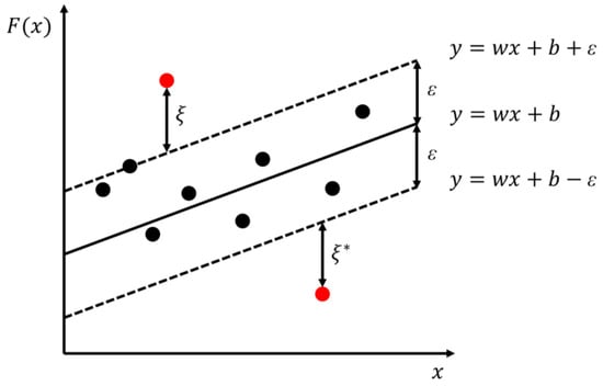SVR is a supervised learning algorithm used for prediction [], based on the statistical learning theory by Cortes and Vapnik []. It determines two flexible hyperplanes with the same distance, ε, around the predicted function symmetrically. The model only penalizes the samples outside the boundaries with a penalization coefficient C, reducing prediction error by minimizing the sum of the squared weight () and the penalization terms (ξ and ξ*), (Figure 2).