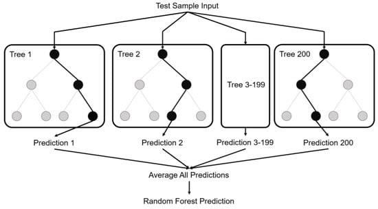 RFR is a supervised learning algorithm that uses an ensemble learning method for regression, which combines several decision trees and aggregates multiple machine learning models to make better predictions than a single model []. The decision trees are constructed in parallel, with no interaction among them. The maximum number of features used at each tree and the number of trees to be grown are two user-defined parameters. At each node, one sample feature among the selected features is searched for the best splitting. The random forest regression consists of k trees, where k is the user-defined number of trees to be grown [,,]. The diagram in Figure 3 shows the structure of a Random Forest with 200 decision trees.