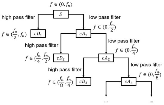 By using DWT, a time series can be divided into two different types of coefficients: approximation and detail coefficients at every decomposition level. The result can be shown as a binary-like tree (Figure 4). The coefficients’ frequency and vector length gradually decrease to half of the upper level as we move down the decomposition tree. For example, the detail coefficient, cD1, in the first level should be half the length of the original signal, S. If the original signal, S, has a frequency ranging from 0 to fn, the cD1 frequency should range from fn/2 to fn. Generally, only approximation coefficients are decomposed continuously [], so our model used detail components in all levels and the approximation component in the deepest level only as features.