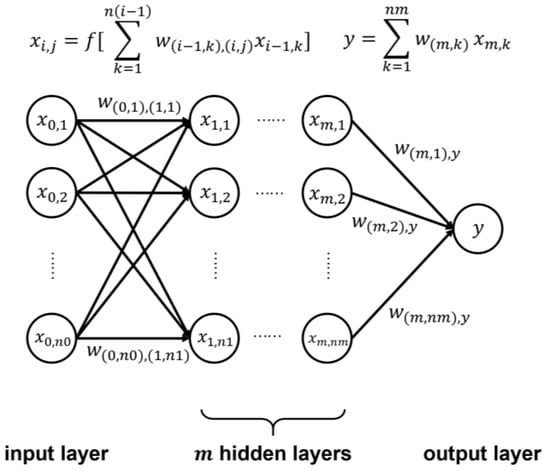BPNN is one of the most typical neural network models [], which is also known as Artificial Neural Network (ANN). It consists of an input layer, several hidden layers and an output layer (Figure 5). For the forward process, each node (except that in the input layer) receives the linear combination of outputs from the previous layer as its input and generates output to the next layer by applying an activation function ( in Figure 5) to the input. Classic activation functions include sigmoid, tanh, ReLU, etc. To minimize error, back propagation should be carried out to properly adjust the weight of the linear combination mentioned above, in which the partial derivative of the loss function with respect to all weights is calculated, and the weights are changed in the direction of the steepest descent of the loss function. Compared with traditional machine learning models, a significant advantage of BPNN is that it can simulate all functions, theoretically. In this study, we used the Pytorch package to construct the network with one hidden layer and chose the ReLU as the activation function. The loss was calculated by the mean squared error (MSE) function.