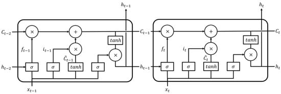 A standard LSTM unit comprises three key structures (Figure 6): a forget gate, the input gate layer and the output gate layer. The first step for an LSTM model design is to decide what should be discarded by the forget gate layer. This gate maps the output, from the last cell and the input, to a feature vector within [0, 1] through a sigmoid layer. Next, the input gate layer will decide what will be updated and stored in the new cell state, by using it and . Finally, the output information, will be filtered after the output gate layer based on our cell state.