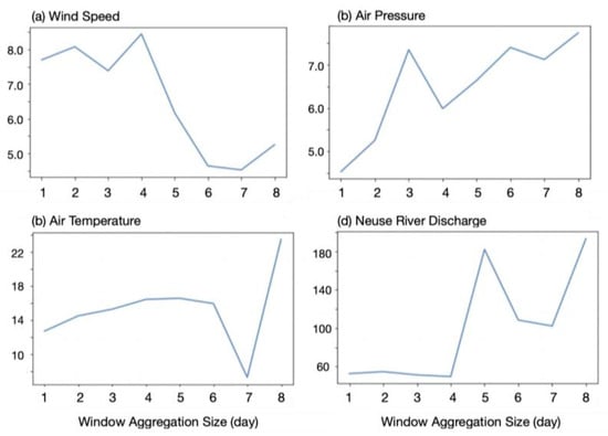 Water quality change can lag behind its predictors, and the lag is determined by domain features [,]. To better capture the time sequence of water quality information, we aggregated features of wind speed, water pressure and air temperature over several days preceding the prediction time with window sizes of 1 to 7 days and 30 days, then applied an input feature selection method to evaluate these aggregated features.