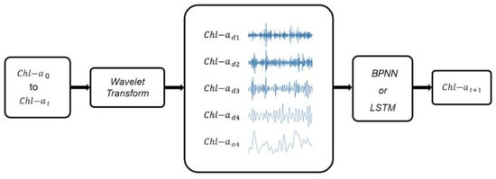Construction of the WA process for LSTM and BPNN models. represents Chl-a at time t. represents the detail component at the xth decomposition level and represents the approximation component at the 4th decomposition level.