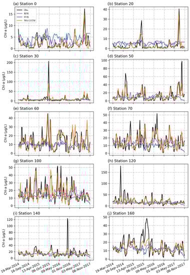 Comparison of the Chl-a () prediction using RFR, SVR and WA-LSTM with in situ observations (Obs.) at NRE stations 0, 20, 30, 50, 60, 70, 100, 120, 140 and 160.