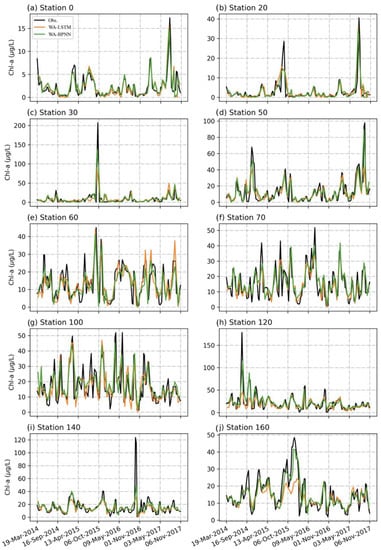 Comparison of the Chl-a () prediction using WA-LSTM and WA-BPNN with in situ observations at NRE stations 0, 20, 30, 50, 60, 70, 100, 120, 140 and 160.