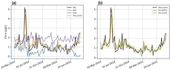 Comparison of the Chl-a () prediction using (a) RFR, SVR and WA-LSTM and using (b) WA-BPNN and WA-LSTM with observations at Scripps Pier station.