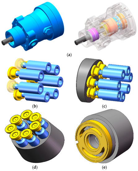 Schematic diagram of structural composition of piston pump. (a) Three-dimensional structural model of hydraulic piston pump. (b) Piston ball heads and slippers. (c) Slippers and swashplate. (d) Pistons and piston holes. (e) Cylinder and valve plate.