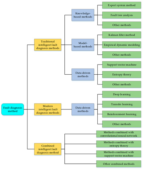 - In this review, the principles and types of fault diagnosis methods that have been developed in recent years were introduced and elaborated. Existing fault diagnosis methods were classified as traditional intelligent fault recognition methods, modern intelligent failure detection methods, or combined intelligent failure detection methods. In addition, existing fault recognition methods were divided into three categories: knowledge-based methods, model-based methods, and data-driven methods.