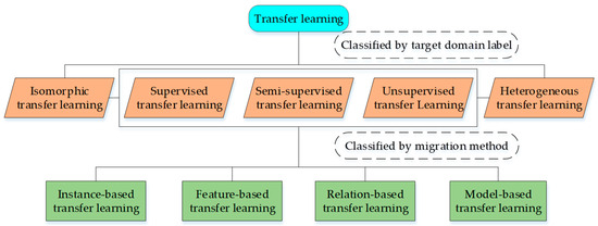 TL refers to a machine learning algorithm that realizes the process of knowledge and theoretical transfer via the correlation of tasks. The sample data are defined as the source domain data set, and the target domain data set is obtained from the measured data [18]. By extracting data from the target domain and the source domain data, the mapping function from the measured data to the sample data is established for fault classification and identification [19]. TL can be classified according to the target domain label and the migration method, as displayed in Figure 4. Such methods mainly include domain-adaptive neural networks, the TrAdaBoost algorithm, multi-task learning, the deep domain confusion model, etc. These methods can migrate the diagnostic task data to other tasks in the case of fewer fault samples and achieve high diagnostic accuracy when the measured data and sample data are different [20].