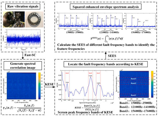 The feature extraction process may be affected by many external factors, so many researchers use various methods to suppress external interference and improve feature extraction capabilities. Gu et al. [45] studied a fault pattern recognition method based on instantaneous speed fluctuation signals, which are used to identify valve plate wear. This approach exhibits a strong anti-noise performance and can solve the problems of nonlinear and nonstationary signals. To address the issue of environmental noise and natural periodic pulses interfering with vibration signals, Gao et al. studied a Teager energy operator demodulation method based on L-kurtosis and an enhanced clustering segmentation algorithm, which effectively suppressed environmental noise and synchronously extracted weak fault features from environmental noise and natural periodic pulses [46,47]. A Walsh-transform-based Teager energy operator demodulation approach for quickly and effectively identifying faults in HPPs was explored. This approach can adaptively denoise the original signal and demonstrates good fault extraction and preprocessing capabilities [48]. As shown in Figure 5, Xiao et al. [49] studied an improved fast spectral correlation algorithm to identify bearing faults in HPPs using frequency band localization, responding to the problem of natural periodic pulses masking the fault excitation pulse from the piston pump bearing. This method uses kurtosis to enhance spectral entropy to locate the fault frequency band in an image, highlight the fault excitation pulse, and finally extract the feature frequency using the square-enhanced envelope spectrum to recognize the fault pattern. Research results indicated that Kurtosis enhanced spectral entropy is very sensitive to periodic pulses and can accurately extract weak fault excitation pulses. Square-enhanced envelope spectrum can enhance nonzero cyclic components by integrating complex values, improving the recognition accuracy of bearing faults. This improved algorithm enhances the ability to extract fault excitation pulses and can effectively prevent natural cycle pulse interference. Chao et al. [50] proposed an approach based on spectral characteristics to address the issue of the noise sensitivity of the vibration signals affecting the failure detection performance of a model. This method denoises time–frequency images and enhances the anti-interference capacity of the diagnostic model against noise and the recognition accuracy for the severity of cavitation in axial piston pumps.