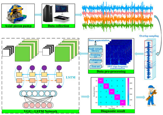 Currently, fault diagnosis methods that combine three or more algorithms have been adopted by some researchers. Such methods can fully integrate the advantages of different algorithms and achieve better fault diagnoses. Liu et al. [111] utilized the characteristics of the locally linear embedding algorithm to reduce algorithm dimensions and extract important feature information. A method comprising the wavelet transform, singular value decomposition, and locally linear embedding algorithm was proposed to achieve fault identification in submersible HPPs. Since the locally linear embedding algorithm cannot preprocess nonlinear signals, combining it with the wavelet transform and singular value decomposition enhanced its ability to extract significant features by decomposing and preprocessing nonstationary or noisy signals. Wang et al. [112] researched a fault diagnosis method that combines the wavelet packet transform, fuzzy entropy, and the linear local tangent space alignment algorithm. This method decomposed high-dimensional features into low-dimensional features with an improved classification performance. The difficulty of feature extraction was solved, and different fault types in HPPs were classified accurately. By integrating the probabilistic neural network with empirical mode decomposition and sensitivity analysis, Du et al. [113] identified the fault severity under different fault modes in piston pumps. This method can diagnose different failure modes and fault degrees in piston pumps with fewer training samples. Tian et al. [114] explored a fault pattern recognition approach based on the wavelet packet transform, singular value decomposition, and an SVM to acquire the transient failure data of piston pumps. The piston wear and swashplate wear were identified accurately and efficiently under small-sample conditions. Zhao et al. [115] aimed to address the nonlinear characteristics of the vibration signals in piston pumps and the issue of mode mixing in empirical mode decomposition. Based on complete ensemble empirical mode decomposition, short-time Fourier transform, time–frequency entropy, and a multi-classification SVM, a fault diagnosis method was proposed. This method was effective in improving feature extraction and failure classification capabilities. Ding et al. [116] focused on the problem of weak feature signals in hydraulic pumps when faults occur. A method combining the empirical wavelet transform, principal component analysis, and the ELM was explored. This method effectively obtained the fault features of HPPs. As shown in Figure 9, Zhu et al. [117] explored a new fault identification algorithm combining the synchrosqueezing wavelet transform, VGG11, and long short-term memory, which effectively identified the common fault categories in HPPs. The synchrosqueezing wavelet transform was employed to transform the state data into two dimensions in terms of time and frequency, and then the depth features of the time-frequency map were obtained. Then, the VGG11 was utilized to perform dimensionality reduction on time-frequency maps through deep feature mining. Moreover, the long short-term memory was used to increase the feature memory ability of the improved algorithm.