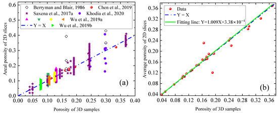 (a) Bulk porosity of 3D parent samples versus areal porosity of 2D cross-sections [17,26,31,36,46,53]; (b) porosity of 3D samples versus average porosity of 2D slices.