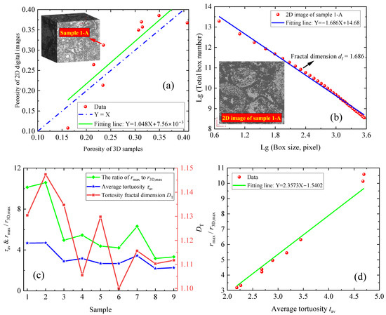 To verify the derived model in Section 2, a cross-section of each sample was sliced and used to estimate the permeability of the corresponding parent sample. Specifically speaking, firstly the 2D pore structure parameters (e.g., rmax, rmin, φ2D, and df) from the 2D digital image were determined; then, based on our derived model, the 3D permeability of the carbonates was predicted. In addition, our predicted 3D permeability was compared to that from D3Q19 LBM to validate the feasibility and effectiveness of our derived model. The experimental data and modeling results are summarized in Table 1. As shown in Table 1 and Figure 4a, the areal porosity (2D porosity) of the cross-section consists of the bulk porosity (3D porosity) of the parent sample. The results (Figure 4a) suggest the slope and the intercept of the fitting line are 1.048 (close to unity) and 7.56 × 10−3 (close to 0), respectively. Similar findings are shown in Figure 2. The results shown in Table 1 suggest that the predicted 3D permeability of each parent sample from the derived model exhibits excellent agreement with the experimental data (the results from the LBM simulations). Taking parent sample 1-A (Figure 4a), for example, in light of the image processing technology, the φ2D of the selected 2D cross-section (Figure 4b) is 31.24%. In addition, with the box-counting algorithm [38], the double logarithmic (Lg) plot of the box size (pixel) versus the total pore number is presented in Figure 4b; then, the pore fractal dimension df (the negative of the slope) was determined to be 1.686. As shown in Figure 4b, the pore structure of the 2D cross-section of sample 1-A has a typical fractal scale. In our modeling, df and φ2D were assigned as 1.686 and 31.24%, respectively. rmax was assigned as 535.06 µm, and φ3D was assigned as 23.5%. Moreover, r3D,max and Df were assigned as 41.18 µm and 2.81, respectively. Then, based on the derived model, the predicted permeability K3D is 27.8 × 10−3µm2, which is in agreement with that determined by the LBM simulation. Figure 4c presents the pore structure parameters (e.g., τav, rmax/r3D,max, and DT) of the samples. As we can see from Figure 4c, the parameter rmax is larger than r3D,max, which is consistent with the results stated by Chen et al. [17]. For these 9 samples, the ratio rmax/r3D,max ranges from 3.18 to 10.58. In addition, DT ranges from 1.10 to 1.15, and τav ranges from 2.19 to 4.69. The results (Figure 4c) also suggest that even from the same parent sample, the different sites behave strongly in heterogeneity. For instance, sample 1-A and sample 1-B come from the same parent sample 1; however, their physical properties vary greatly. Figure 4d presents the average tortuosity versus the ratio rmax/r3D,max. The results (Figure 4c) show that there exists an approximately linear relationship between the ratio of the maximum pore radius in 2D space to that in 3D space (rmax/r3D,max) and the average tortuosity of porous media. Physically, when the average tortuosity of porous media is unity, the corresponding ratio rmax/r3D,max approximately equals unity. As we can see from the fitting equation, when τav is assigned as unity, rmax/r3D,max is determined to be 0.82, which is close to unity, which verifies our model. The reason for the deviation may be caused by the computational error.