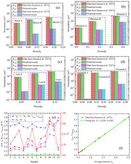 Modeling results of the samples [26]: (a) the predicted permeabilities from the derived model versus the data for Berea samples; (b) the predicted permeabilities from the derived model versus the data for Bitumen samples; (c) the predicted permeabilities from the derived model versus the data for Font samples; (d) the predicted permeabilities from the derived model versus the data for Grosmont samples; (e) the determined pore structure parameters for various samples; (f) τav versus the ratio rmax/r3D,max for various samples.