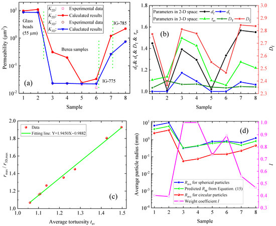 Modeling results of the samples: (a) predicted permeability (K2D and K3D) and experimental data; (b) the determined pore structure parameters (df, dt, τav, DT, and Df) of various samples; (c) τav versus the ratio rmax/r3D,max for various samples; (d) the predicted average particle radius for spherical particles and circular particles versus that from Equation (15).