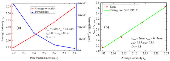 The influence of parameter DT on the τav and K3D are shown in Figure 8. In this case, the basic parameters applied in the model are summarized in the corresponding figures. During the calculation, the parameter Df was assigned as 2.2, and the parameter DT ranged from 1.05 to 1.2. Based on our derived model, the parameter r3D,max ranges from 2.2 µm to 0.07 µm. The results (Figure 8a) suggest that a larger τav corresponds to a larger DT. However, K3D decreases as DT increases. Specifically, for this case, when DT increases up to a certain value (e.g., DT ≥ 1.2), the value of K3D is extremely small. The main reason is that a larger value of DT means larger seepage resistance, resulting in a small value of K3D. Figure 8b also reveals that τav has distinct linear correlations with the ratio rmax/r3D,max. Similar findings have been also demonstrated in Figure 6.
