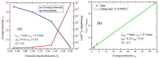 After validation with exhaustive experimental data, this derived model was utilized for sensitivity analysis of different parameters (Df and DT) on the 3D permeability of porous media. Figure 7 shows the influence of pore fractal dimension Df on the average tortuosity τav and K3D of porous media in 3D. In this case, the maximum and minimum pore radii in 2D were 3 µm and 0.13 µm, respectively. The parameters φ2D and φ3D were both 0.15, and parameter DT was 1.1. During the calculation, the parameter Df ranged from 2.2 to 2.8. Based on our derived model, the maximum pore radius in 3D space r3D,max was determined, which ranged from 1.4 µm to 0.82 µm. In addition, the determined parameter r3D,min ranged from 0.0077 µm to 0.0045 µm. Specifically, when parameter Df was assigned as 2.2, the corresponding values of r3D,max and r3D,min were 1.4 µm and 0.0077 µm, respectively. As one can see from Figure 7a, there exists a positive relationship between Df and the average tortuosity τav. The main reason is that a larger value of Df means a more complex pore structure of porous materials, leading to a larger value of τav. Furthermore, the permeability of porous media in 3D decreases with an increase in Df, which is anticipated. Figure 7b demonstrates that the linear correlativity between τav and the ratio rmax/r3D,max is very prominent. Moreover, when τav is assigned as unity, rmax/r3D,max is determined to be 0.9951, which is close to unity.