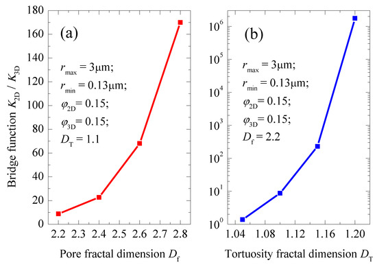 Effects of Df and DT on the bridge function fbridge: (a) pore fractal dimension Df versus the bridge function K2D/K3D; (b) tortuosity fractal dimension DT versus the bridge function K2D/K3D.
