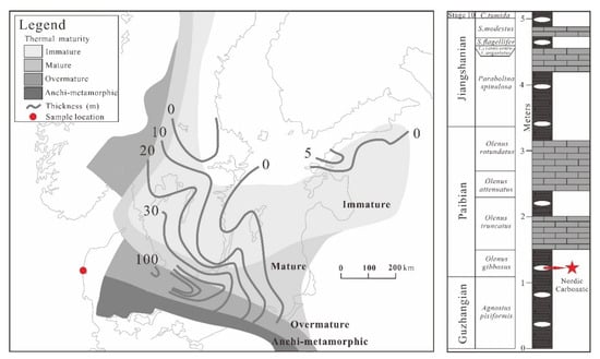 Thickness and thermal maturity of the Alum Shale Formation and stratigraphic column (modified from the reference [23]).