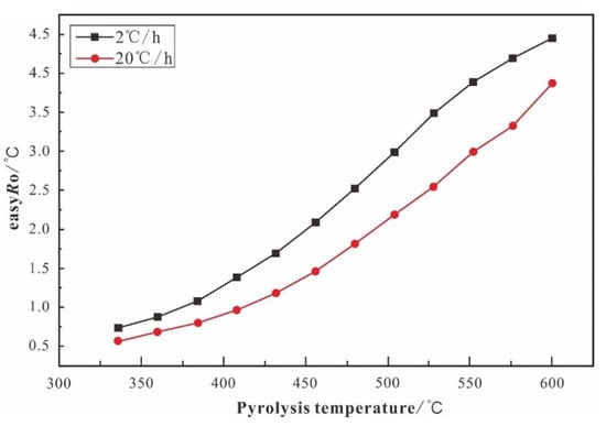 Hydrocarbon generation thermal simulation experiments were carried out under heating rates of 20 °C/h and 2 °C/h. As shown in Figure 2, the easyRo value continues to increase with increasing pyrolysis temperature. In the experimental temperature range, the corresponding easyRo value was 0.57% (20 °C/h)/0.74% (2 °C/h) at the lowest temperature of 336 °C, and the easyRo value was 3.87% (20 °C/h)/4.45% (2 °C/h) at the highest temperature of 600 °C.