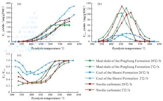 The experimental results showed that the methane (C1) yield of the Nordic carbonate increased rapidly with increasing temperature during the thermal simulation and maintained a high growth rate at the highest temperature of 600 °C, indicating that there was still a strong potential for methane production at this time. The C1 yield of the mud shale of the Pingliang Formation increased continuously from 336 °C to 504–552 °C during the thermal simulation and decreased significantly to almost zero at higher temperatures (easyRo > 2.99%). The C1 yields of the coal of the Shanxi Formation were close to those of the Nordic carbonate until 530 °C, with higher C1 yields for the coal of the Shanxi Formation at higher temperatures (Figure 4a).