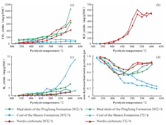 Carbonate thermal simulation of hydrocarbon production rate with temperature variation characteristics, and out of shale and Shanxi coal group of hydrocarbon production rate. (a) Carbonate thermal simulation of CO2 yields with temperature variation characteristics, and out of shale and Shanxi coal group of hydrocarbon production rate; (b) Carbonate thermal simulation of H2S yields with temperature variation characteristics, and out of shale and Shanxi coal group of hydrocarbon production rate; (c) Carbonate thermal simulation of H2 with temperature variation characteristics, and out of shale and Shanxi coal group of hydrocarbon production rate; (d) Carbonate thermal simulation of non-hydrocarbon/total pyrolysis gas with temperature variation characteristics, and out of shale and Shanxi coal group of hydrocarbon production rate.