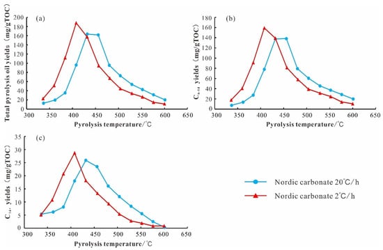 The characteristics of the liquid hydrocarbon yield with temperature change in the Nordic carbonate during thermal simulation are shown in Figure 6. The oil yield rate showed the parabolic characteristics (first increase and then decrease) under different heating rates, and the oil yield curve change trend of the two heating rates was the same. However, the peak temperature of the oil production rate of the 2 °C/h series was lower than that of the 20 °C/h series, and the difference between the two was approximately 20~50 °C. At 20 °C/h, the oil production rate peaked at 163.40 mg/gTOC at 456 °C. At 2 °C/h, the oil production rate peaked at 187.64 mg/gTOC at 408 °C, that is, the oil production rate was higher at a low heating rate. Compared with the 2 °C/h series, the oil production peak of the 20 °C/h series lagged behind (Figure 6), and the easyRo corresponding to the oil production peak was 1.47% and 1.38%, respectively. This was higher than the actual geological conditions, which was determined by the inherent difference between short-term high temperature and long-term low temperature. The oil production rate was higher at the later high heating rate, which fully reflected the mutual compensation relationship between time and temperature in the hydrocarbon production process. Compared to gaseous hydrocarbon yields, liquid hydrocarbon yields reached a maximum at relatively low temperatures, a result that could be attributed to the closed thermal simulation system. In the closed system, organic matter will preferentially crack to form high-carbon-number hydrocarbons, while as the temperature increases to a certain value, the high carbon number in hydrocarbons will also gradually crack to form a low carbon number in hydrocarbons. The yield of liquid hydrocarbons will gradually decrease after peaking, mainly because the rate of hydrocarbon cleavage is greater than the rate of production. In addition, as thermal evolution proceeds, the high carbon number of hydrocarbons will eventually crack into methane [50,51].