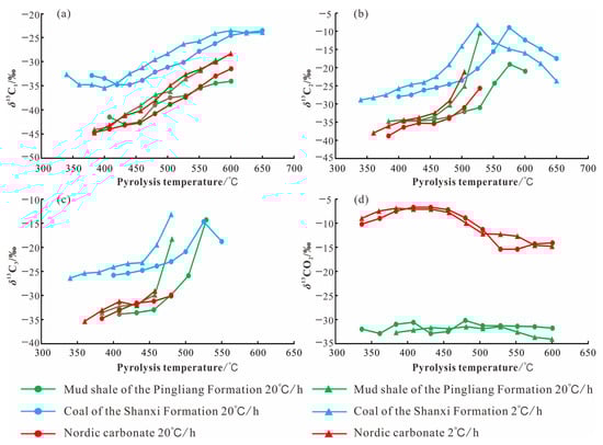 Carbonate rock pyrolysis gas product deltaδ13C characteristics with the temperature and the delta of out shale pyrolysis gas and Shanxi coal products δ13C. (a) Carbonate rock pyrolysis gas product deltaδ13C1 characteristics with the temperature and the delta of out shale pyrolysis gas and Shanxi coal products δ13C1; (b) Carbonate rock pyrolysis gas product deltaδ13C2 characteristics with the temperature and the delta of out shale pyrolysis gas and Shanxi coal products δ13C2; (c) Carbonate rock pyrolysis gas product deltaδ13C3 characteristics with the temperature and the delta of out shale pyrolysis gas and Shanxi coal products δ13C3; (d) Carbonate rock pyrolysis gas product deltaδ13CO2 characteristics with the temperature and the delta of out shale pyrolysis gas and Shanxi coal products δ13CO2.