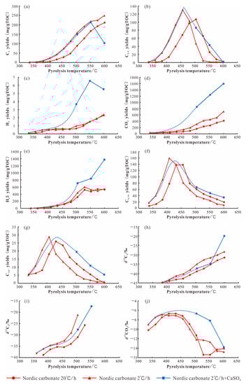 Carbonate thermal simulation results with the temperature change characteristics and product after joining CaSO4 contrast. (a) Characterization of the carbonate C1 yields as a function of temperature versus the temperature change with the addition of CaSO4 and a comparison of the products; (b) Characterization of the carbonate C2-5 yields as a function of temperature versus the temperature change with the addition of CaSO4 and a comparison of the products; (c) Characterization of the carbonate H2 yields as a function of temperature versus the temperature change with the addition of CaSO4 and a comparison of the products; (d) Characterization of the carbonate CO2 yields as a function of temperature versus the temperature change with the addition of CaSO4 and a comparison of the products; (e) Characterization of the carbonate H2S yields as a function of temperature versus the temperature change with the addition of CaSO4 and a comparison of the products; (f) Characterization of the carbonate C6-14 yields as a function of temperature versus the temperature change with the addition of CaSO4 and a comparison of the products; (g) Characterization of the carbonate C14+ yields as a function of temperature versus the temperature change with the addition of CaSO4 and a comparison of the products; (h) Characterization of the carbonate δ13C1 as a function of temperature versus the temperature change with the addition of CaSO4 and a comparison of the products; (i) Characterization of the carbonate δ13C2 as a function of temperature versus the temperature change with the addition of CaSO4 and a comparison of the products; (j) Characterization of the carbonate δ13CO2 as a function of temperature versus the temperature change with the addition of CaSO4 and a comparison of the products.