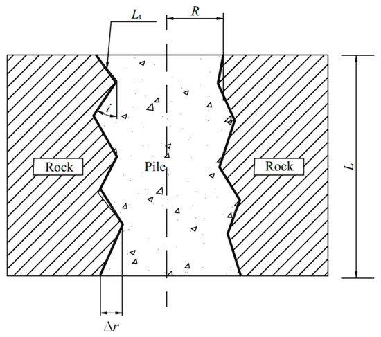 Due to the internal cohesion of intact rocks and the non-integrity of jointed rock masses, the pore-forming process of rock-socketed piles will produce a rough surface on the socket sidewall, as shown in Figure 1. Pells et al. [11] first recognized the influence of different roughness degrees of sidewalls on the bearing characteristics of shaft resistance of rock-socketed piles, and proposed a set of criteria for empirically classifying sidewall roughness, as shown in Table 1.