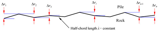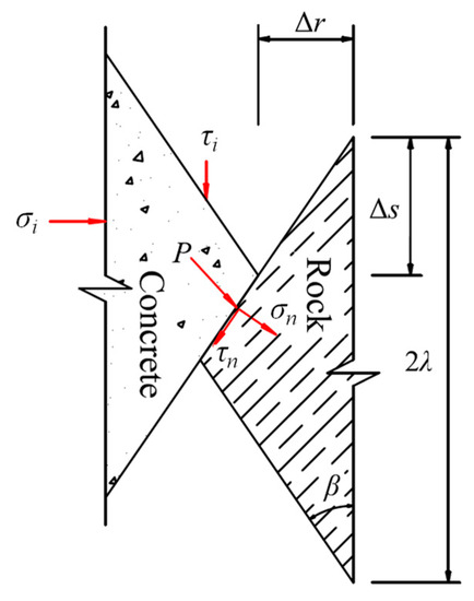 The beneficial effect of socket roughness is a combined consequence of the dilational nature of a rough concrete–rock interface and the constant normal stiffness (CNS) boundary condition which governs the normal stress at the concrete–rock interface. The pile–rock interface is usually simplified into a plane stress problem with a set of regular triangular asperities in theoretical studies [20,21,22,23]. The present study follows the same idea, and specifically, the socket sidewall profile is simplified as triangular asperities, and micro-mechanical analysis is performed on the shear behavior of one representative asperity, which is depicted in Figure 10, and the triangle asperity can be quantitatively characterized by three geometric parameters, i.e., roughness angle β, half-chord length λ and chord height h, and the relationship between the three parameters is: