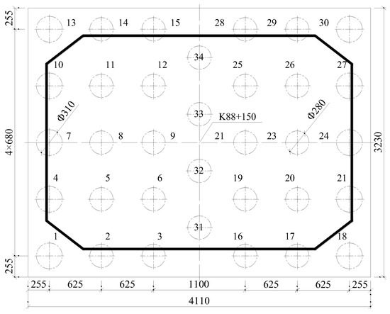 The No. 6# and 7# cable towers in the Chishi Bridge on the Ru-Chen Expressway in China are supported by group pile foundations, which are bored cast-in-place rock-socketed piles by rotary drilling construction technologies. Since the bridge is located in karst areas, the geological condition of the bridge site is very complicated. The overall distribution and plane size of No. 6# and 7# group piles are the same, and the layout diagram of group pile foundation is shown in Figure 5.