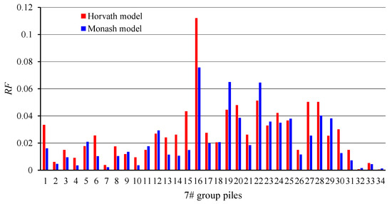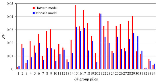 Although the RF values calculated by the Monash and Horvath models are different, which could be specifically recognized from Figure 7, the maximum values in the No. 6# group piles are the 15th and 21st holes, and the minimum value is the 32nd hole. The RF value of each socket of the No. 6# group piles obtained by the two models is roughly similar. For No. 7# group piles depicted in Figure 8, the minimum RF obtained under the two models is the 34th hole, and the maximum RF is the 16th hole. The RF in the rock-socketed sections of the No. 6# and 7# group piles under different roughness intervals is counted, as shown in Table 6: