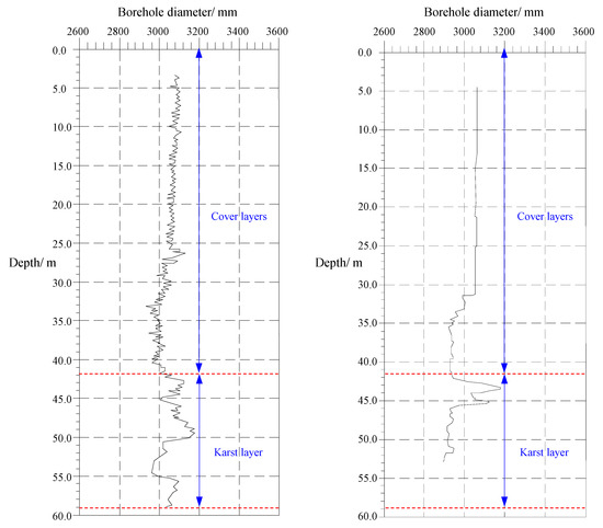 The geometry of typical socket curves is shown in Figure 9 (wherein the left shows the 16th socket in No. 6# group piles with B = 2.8 m, L = 54.50 m; and the right shows the 20th socket in No. 7# group piles with B = 2.8 m, L = 48.50 m). It can be seen that the surface curve of the former in the covering layer is relatively uneven and the lower part is extremely rough, because the covering layer consists of pebbles and boulders, while the lower part belongs to the karst-developed area, and karst ditches exist for the whole length along the lower drilling holes. At the same time, the surface curve of the latter in the covering layer is relatively uniform, but the lower part is extremely rough, because the covering layer consists of planting soils and silty sands, while the lower part belongs to the karst-developed area, and a karst ditch or cave appears to exist at a level of about 42~46 m.