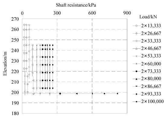 According to the geological survey, the bearing strata of the testing pile can be divided into three layers: the uppermost elevation of 265~245 m is the boulder layer; the middle elevation of 245~200 m is the interlaced karst layer of ditches and fissures; and the lower part (5 m deep until the pile tip) is the limestone layer. The rock mass at this depth has a high integrity and thus is selected as the bearing stratum of the pile tip. The load-shaft resistance response of the testing pile in the field load tests is shown in Figure 11, where the shaft resistance of the three layers is averaged, and the mobilized shaft resistance in the lower part is larger than that in the middle part, especially under the action of the last few levels of loads. Compared with the recommended mechanical indexes of soil and rock layers listed in Table 2, the observed shaft resistance of the testing pile is about two times the design expectation, indicating that the design of group piles foundation is very conservative.