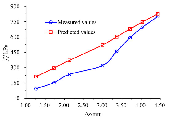 Based on the theoretical model discussed in Section 4.2, the estimated shaft resistance with a consideration of the sidewall roughness at different relative settlement of the pile–rock interface can be easily obtained, and also depicted with red line in Figure 12. It can be seen that, the theoretical model generally overestimates the shaft resistance compared to the field load test at the same ∆s, and after the ∆s reaches larger than 3.00 mm, the deviation is less than 15%. This may be caused by the “filter cake” on the pile–rock interface deposits from the wall-protecting slurry during the forming process of rock sockets, which is similar to a weak interlayer in layered rock masses. The filter cake can reduce the elastic modulus E used in Equation (12) to a certain extent, especially at the early stages of the field loading tests, at this time, the filter cake has not been fully compacted, and as a consequence, the surrounding rock masses can only provide a lower global stiffness to piles.