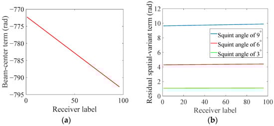 Assuming that the closest vertical slant distance between the target and SAS is 100 m, the variation curves of the BCT and RSVT with receivers are shown in Figure 5. It can be seen that the BCT changes rapidly with receivers, and the maximum difference of the BCT far exceeds radians, so each receiver must be compensated separately. The RSVT changes slowly with receivers but rapidly with the target’s squint angle. The difference between different squint angles of the same receiver far exceeds radians, while the maximum difference between receivers at the same squint angle is only about 0.26 radians, which is far less than the radians required for imaging. Therefore, when compensating for RSVTs with different squint angles, the RSVT of the reference receiver can be used to replace the RSVTs of other receivers.