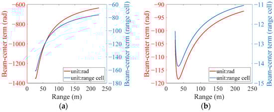 In the beam at time as shown in Figure 4, the BCT of the first receiver (edge receiver) is shown in Figure 6a. It can be seen that the variation range of the BCT in the entire swath far exceeds radians and a range cell. To fully show the changes in the BCT, the sway, heave, yaw, and pitch are reduced to 0.1 m, 0.1 m, 1°, and 1°, respectively. At this time, the BCT is shown in Figure 6b. It can be seen that the variation range of the BCT still exceeds radians and a range cell. Therefore, when compensating the BCT, the phase compensation function must be updated with range, and the RCM caused by the BCT is compensated by interpolation.