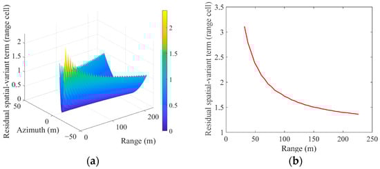 It should be noted that the phase compensation is performed before the RCMC of the RD algorithm. Therefore, when the azimuth frequency is not zero in the subaperture RD domain, the true vertical distance of the target is not , but , where is the azimuth angle. Substituting this as the vertical distance into (20) will introduce an error, but Figure 7b shows that this error caused by RCM can be completely ignored.