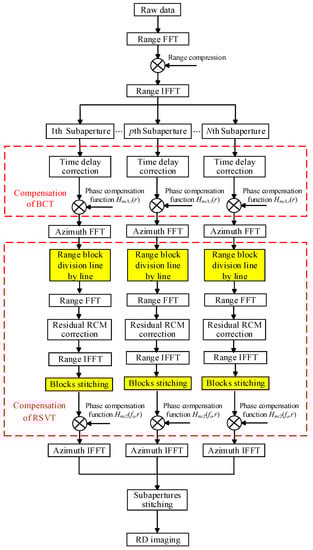 The first stage mainly compensates the BCT. We adopt a one-step MOCO to comprehensively correct the time delay and phase error of the BCT after range compression and before RCMC. The second stage mainly compensates the RSVT. After dividing the data into a series of subapertures along the azimuth-time domain, the corresponding relationship between Doppler frequency and the target azimuth angle is used to compensate for the RSVT in the azimuth-frequency domain. Considering the 2D spatial-variant characteristics of residual RCM caused by the RSVT, the range block compensation is performed. Figure 8 shows the detailed flow of the proposed MOCO algorithm.