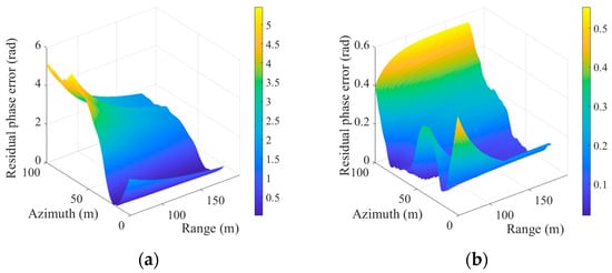 After the above compensation steps, the range history error is essentially compensated, but there is still a residual phase error. In Section 5.1, we analyze the residual phase error through simulated data. Generally, the residual phase error fulfills the imaging requirements of less than one-eighth of the wavelength.