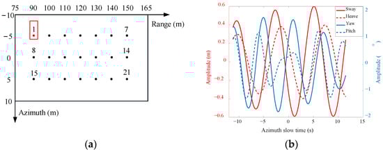 It can be found that the roll is not included in (4), but this only indicates that the roll does not affect the range history of the signal in the coordinate system shown in Figure 2. However, since all the transmitters and receivers are mounted on the periphery of the platform, any roll component generates the and coordinates of the transmitters and the receiver. To simplify the discussion, the motion errors discussed in this paper were converted into motion errors in the coordinate system shown in Figure 2.