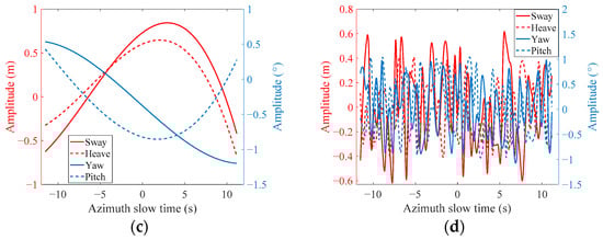 As shown in Figure 4, the SAS system moves along the azimuth direction to collect data. The black solid line represents the ideal trajectory, and the red dashed line represents the actual motion trajectory. Without the loss of generality, the motion errors at time are set to the maximum value of motion errors in Figure 3; then, the sway, heave, yaw, and pitch are 0.6 m, 1.3 m, 1.2°, and 1.4°, respectively.