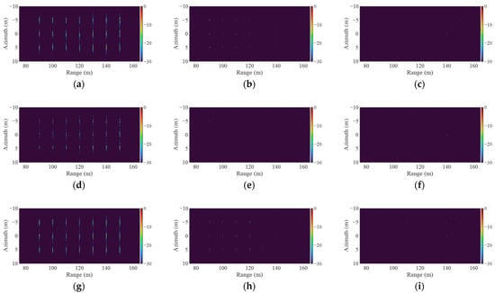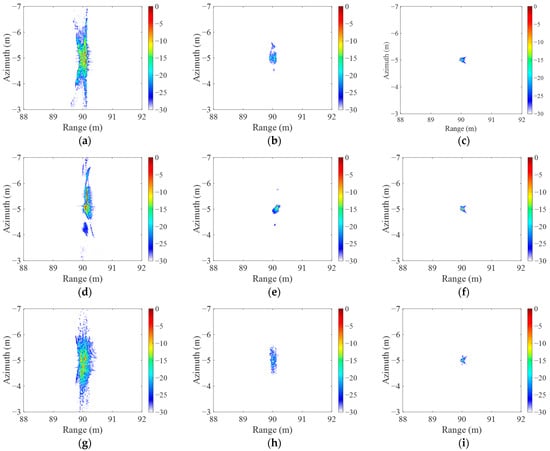Compensation results of target 1 under different distributed motion errors using the three algorithms: (a) the result of the algorithm in [] under sinusoidal motion errors; (b) the result of the SATA algorithm under sinusoidal motion errors; (c) the result of the proposed algorithm under sinusoidal motion errors; (d) the result of the algorithm in [] under cubic polynomial motion errors; (e) the result of the SATA algorithm under cubic polynomial motion errors; (f) the result of the proposed algorithm under cubic polynomial motion errors; (g) the result of the algorithm in [] under uniform random motion errors; (h) the result of the SATA algorithm under uniform random motion errors; (i) the result of the proposed algorithm under uniform random motion errors.