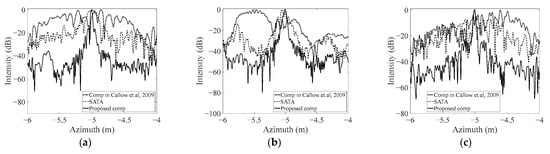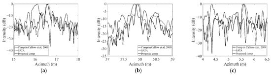 Comparison of the azimuth profiles for different targets using the three compensation algorithms: (a) target 1; (b) target 3; (c) target 5 [].