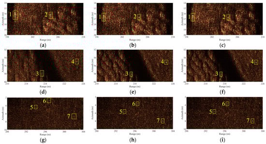 Imaging results of different regions using the three compensation algorithms. (a,d,g) are the results of compensation in []. (b,e,h) are the results of the SATA algorithm. (c,f,i) are the results of the proposed compensation algorithm.